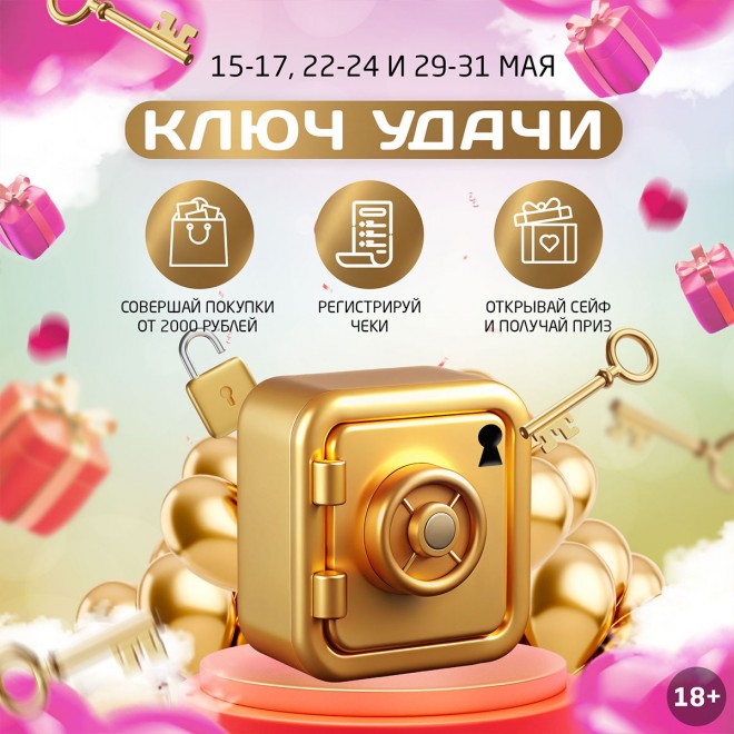 ТРЦ «РИО» Коломна запускает акцию «Ключ удачи» с 15 по 31 мая. При покупке на сумму от 2000 рублей вы получаете возможность зарегистрировать чек и попробовать открыть сейф с помощью ключа.